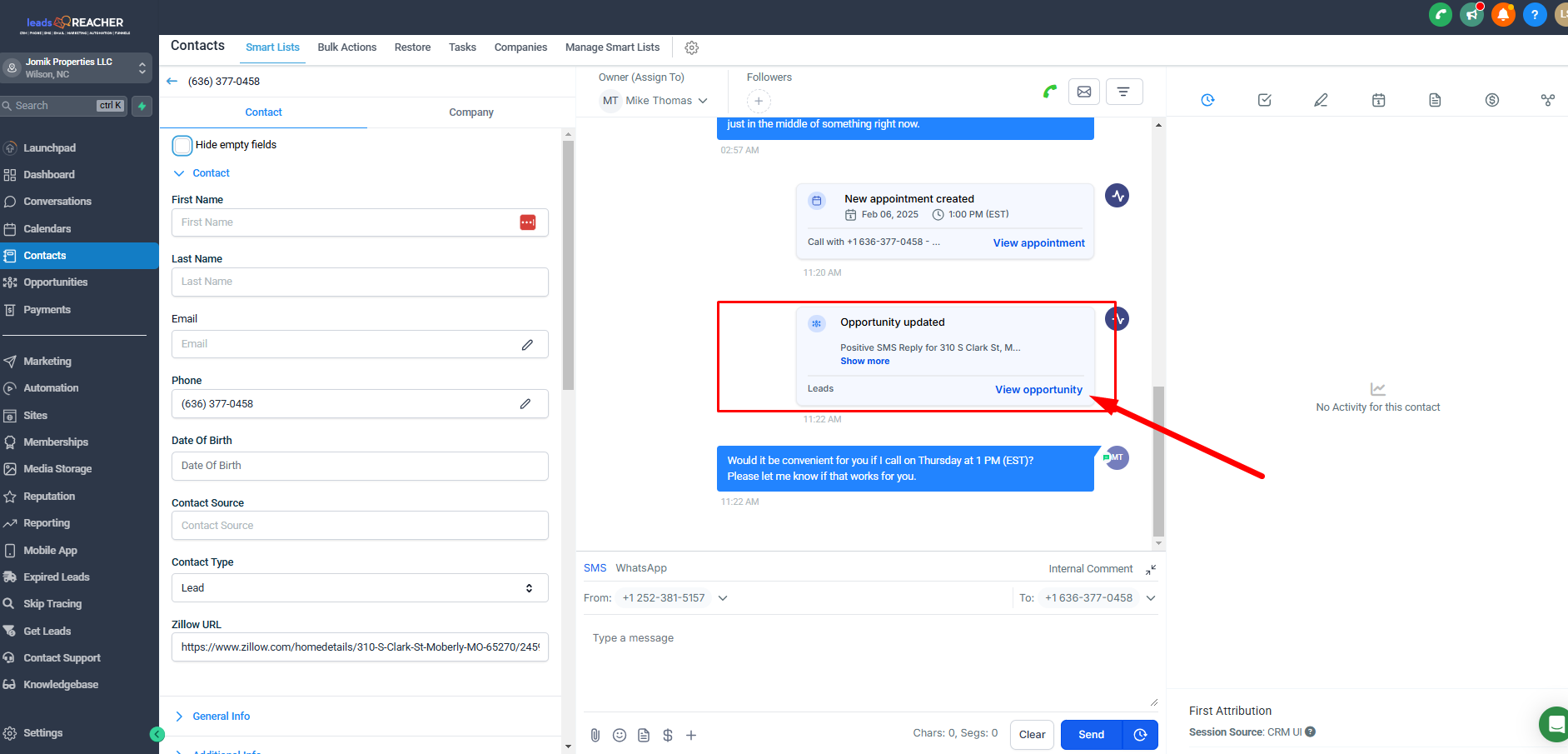 Within the conversation, find the Opportunity related to the contact record and click View Opportunity.