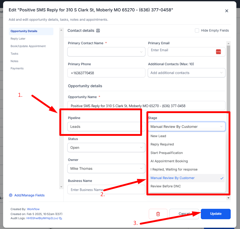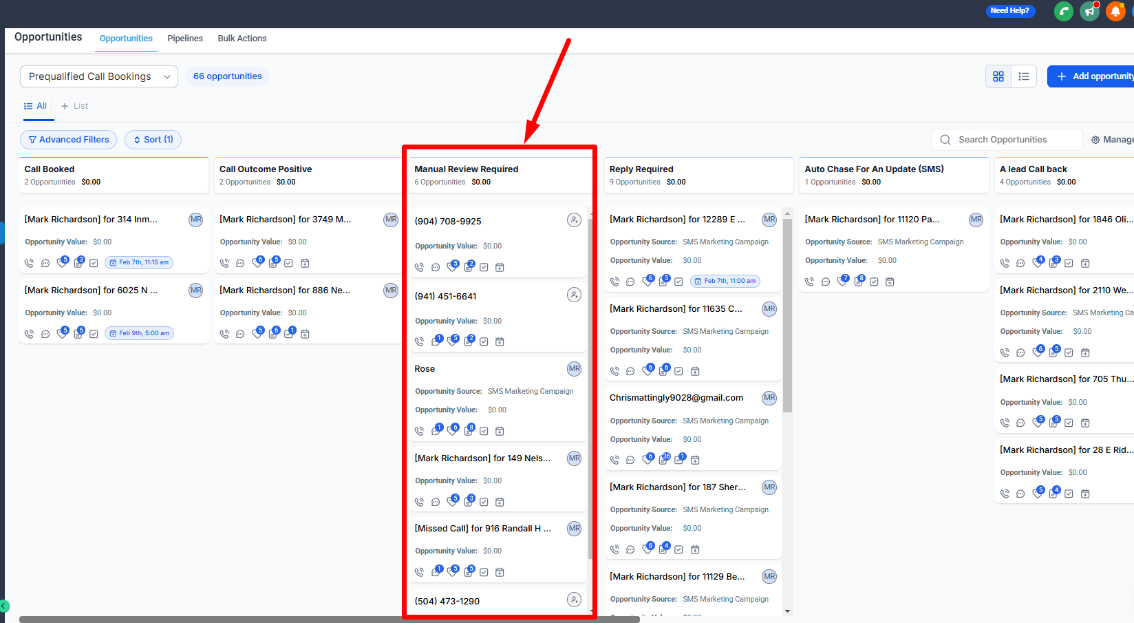 This will stop all activity on the lead and move the opportunity to the Manual Review Required section of your Prequalified Call Bookings pipeline.