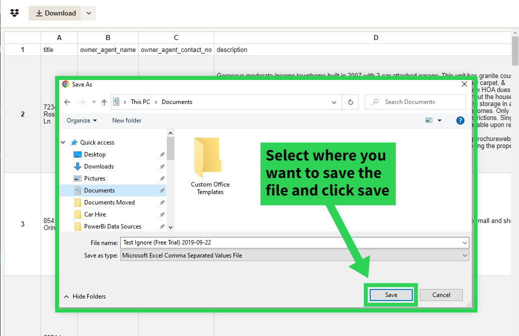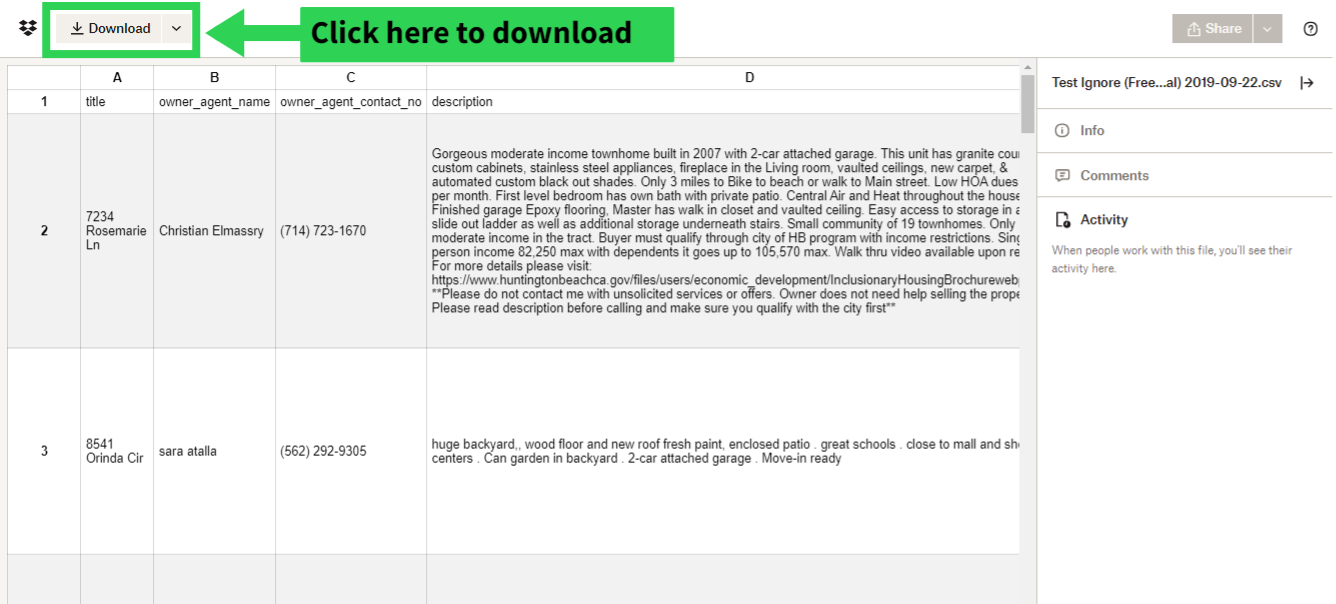You will be taken to dropbox where you can see a preview of your data. To download your data simply click the download button, choose where you want to save the file, and click 'Save'