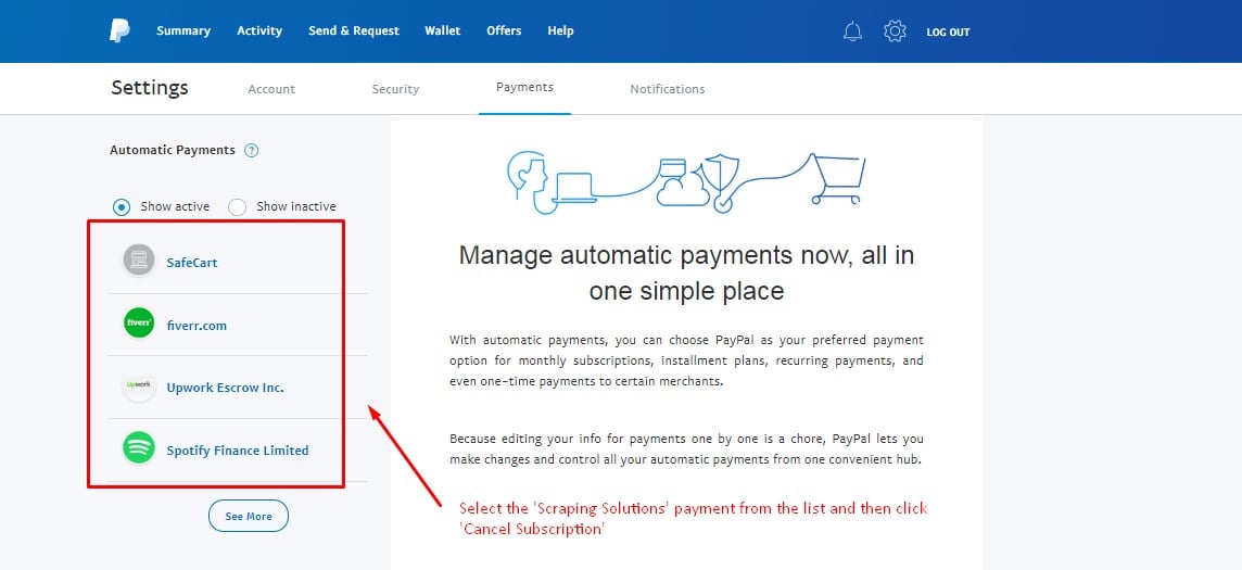 From the list choose the Scraping Solutions subscription you wish to cancel and click on it, when it opens simply click the 'Cancel' button. You will then be asked to confirm your cancellation by clicking 'Cancel Automatic Payments'.