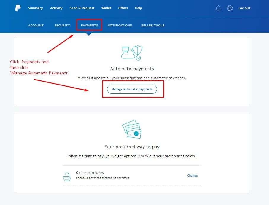 On the next screen click 'Payments' followed by 'Manage Automatic Payments'